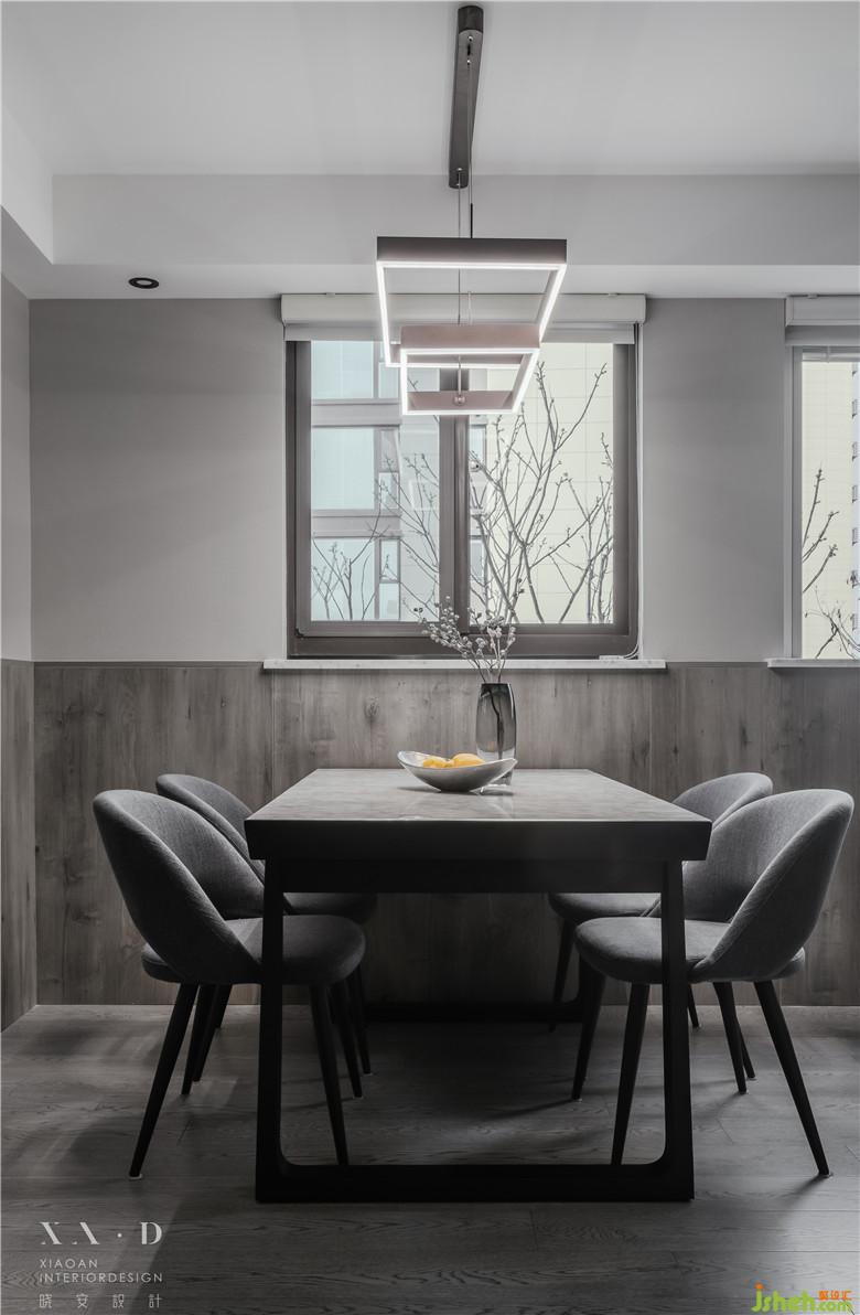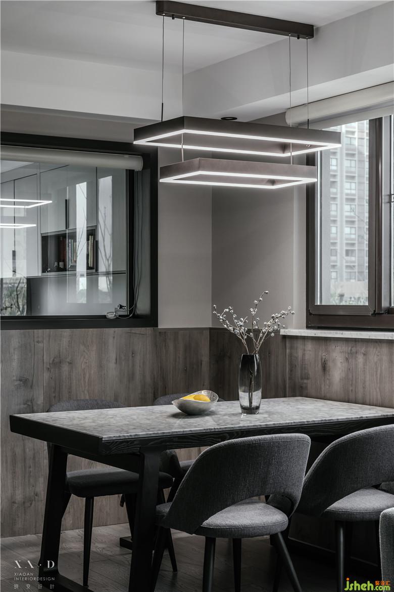 室內(nèi)設(shè)計(jì)師運(yùn)用開闊的空間設(shè)計(jì)手法,將餐區(qū)、客廳相連,擴(kuò)大視覺感受,設(shè)計(jì)出滿足個(gè)性化生活需求的流暢動(dòng)線?;疑蹬c木飾貫穿空間,燈具由幾何線條塑造造型,玫瑰金色外觀增加美觀度。