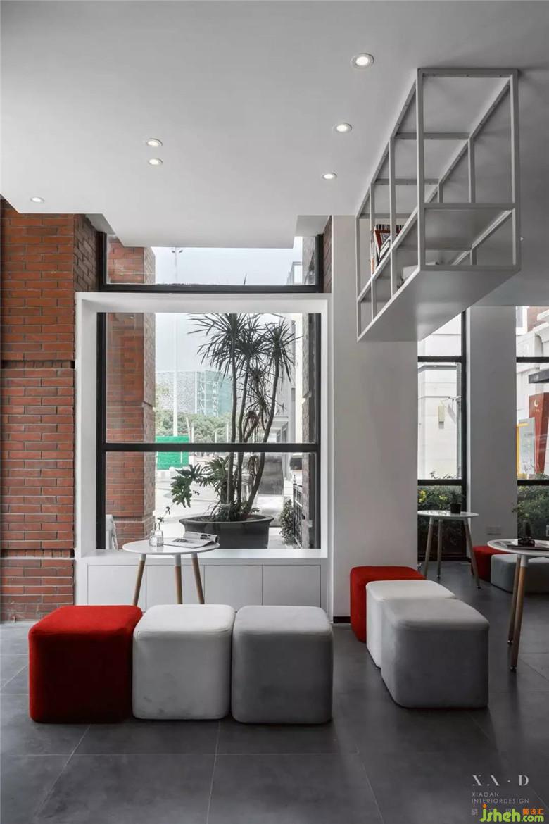 吧臺也用了紅色來點綴整個白色空間,做了懸挑,200公斤的鋼板仿佛掙脫了萬有引力,室內設計師使整個紅色越發(fā)的跳躍且明亮,吧臺懸挑的紅色設計隱喻了新鮮的血液(教練團隊),帶領我們(健身的人)循環(huán)于心臟的流動,重復的對抗,沖破,使我們更加健康向上。