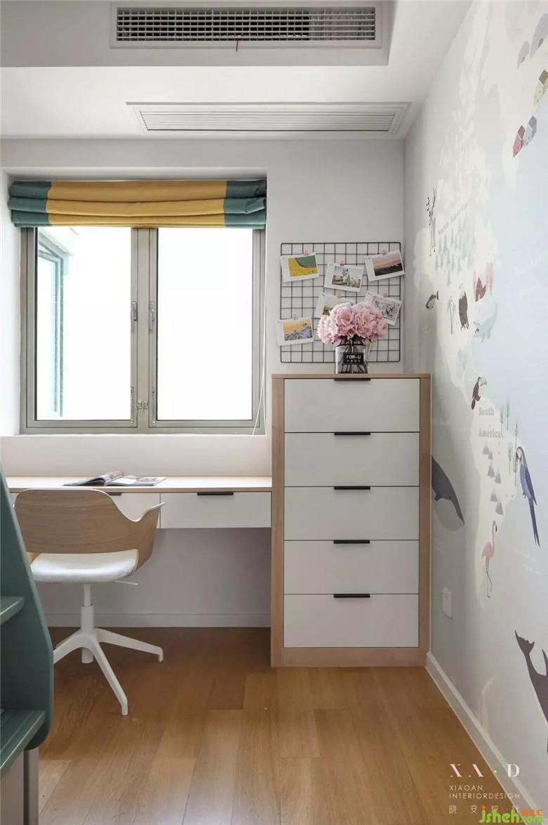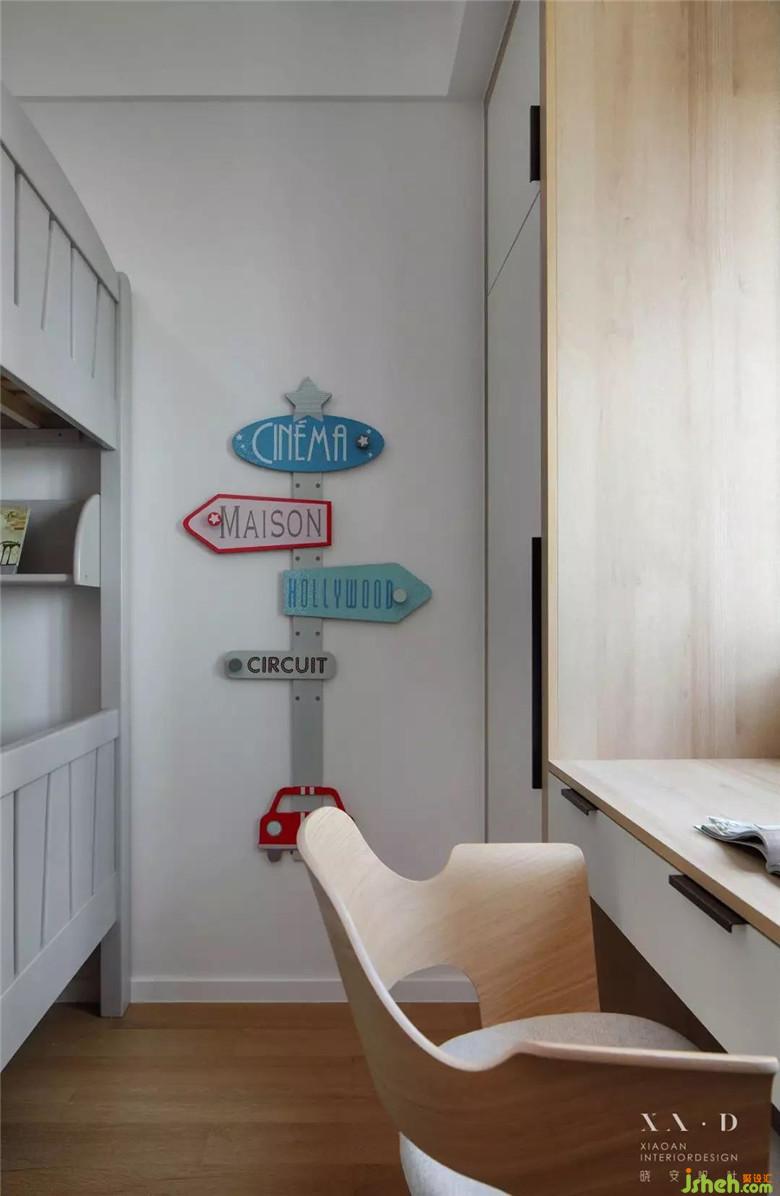 書桌面對(duì)著窗戶放置,方便以后姐姐上學(xué)書寫作業(yè)使用。墻面的卡通墻飾既可以掛東西又增添了空間的童趣,五斗柜上方的格子鐵架放置孩子們?nèi)粘5木仕查g影像,給孩子們留下一個(gè)美好的童年記憶。