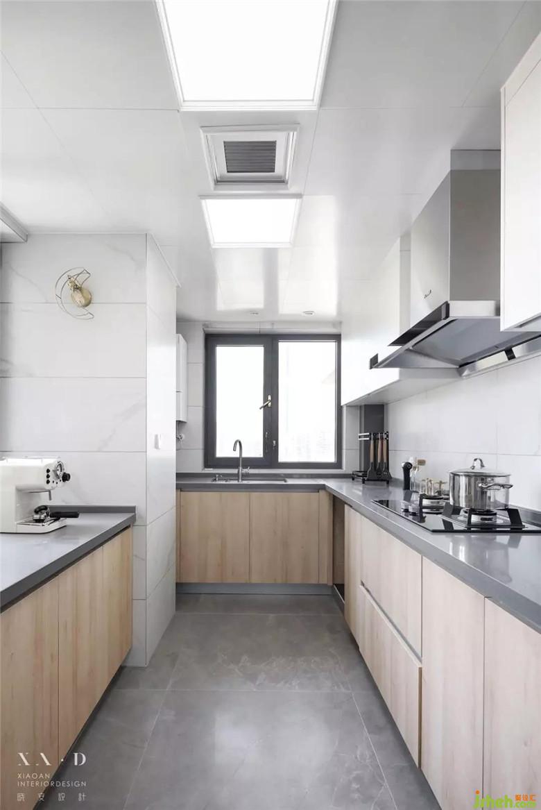 廚房的門選用了比較有意思的門型,谷倉門,一是可以用平移的方式又不占用廚房和餐廳的開門空間,二是可以起到裝飾性的效果。谷倉門選用格子玻璃,這樣有效利用了原本廚房的采光。