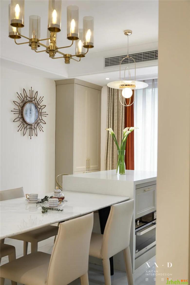 午后閑暇,銅制的花形時(shí)鐘讓時(shí)光流得更慢。纖細(xì)的金屬高腳椅,舒適而自由。坐在島臺上煮茶看花,午后的陽光透過窗戶照射進(jìn)來,渾身暖融融,那一刻,就懂得了裝修公司設(shè)計(jì)中流動的節(jié)奏感。