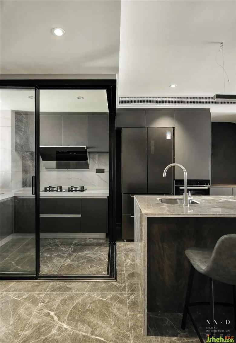 廚房和餐廳之間隔著一道玻璃門,裝修公司讓這兩個空間在視覺上密不可分。穩(wěn)重的大理石吧臺連接著內(nèi)斂的黑色餐桌,坐在餐桌上,能看見廚房里烹飪者的一舉一動,互動更親密。