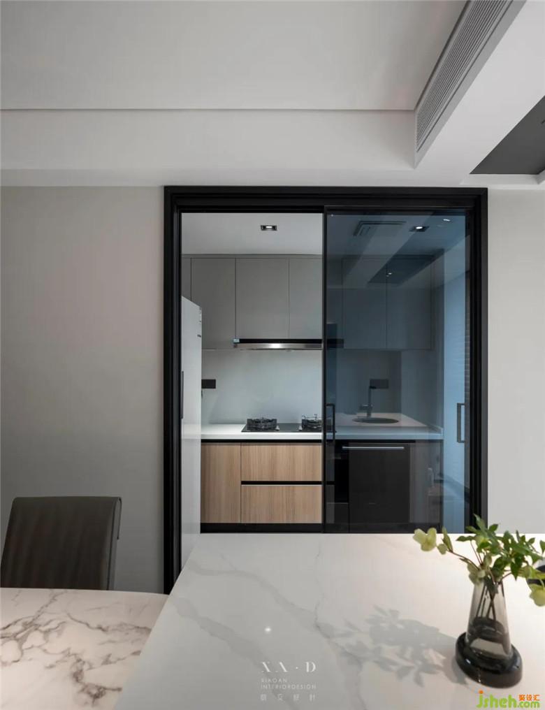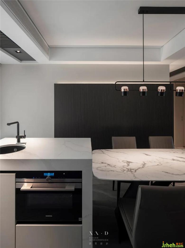▲ 大理石餐桌與島臺相連。