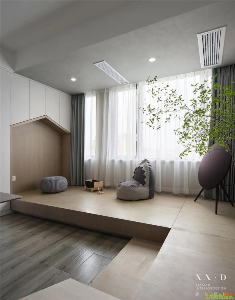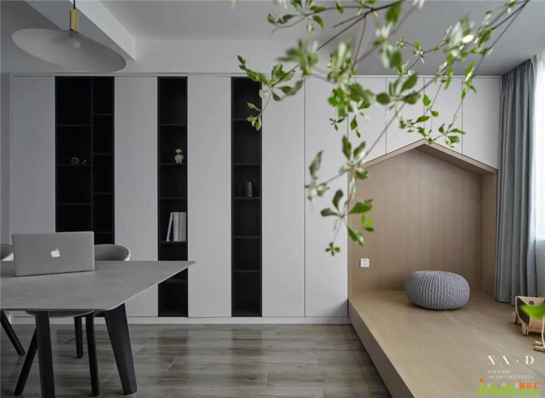 我們家設(shè)計的最主要的亮點在客餐廳,因為我們夫婦都是老師,所以根據(jù)我們的需求和生活習慣,裝修公司設(shè)計師在一樓空間沒有放置沙發(fā),將原有的客餐廳用書桌、書柜以及地臺與榻結(jié)合形成的樓梯代替了,這樣我們的孩子在地臺玩耍的時候,我們就可以一邊工作一邊照顧他。