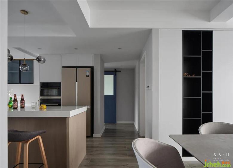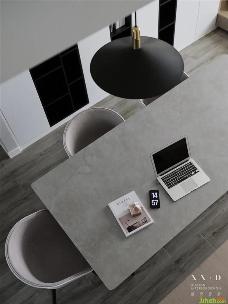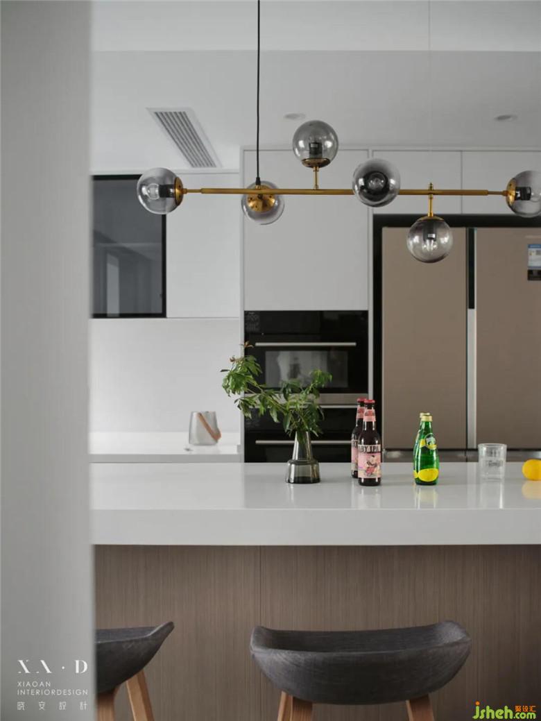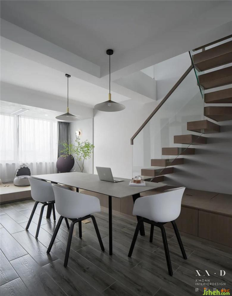 裝修公司將原有的廚房被打通后,留下的空間被改造成了西廚和餐廳。餐廳居于樓梯之下,無論從哪個方向走向餐廳,都是沒有遮擋的,動線明確清晰。餐桌椅靠近西廚,可以免受油煙的侵擾。
