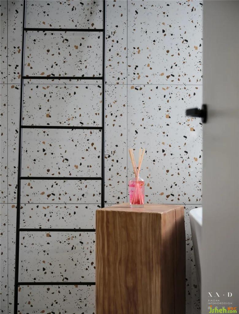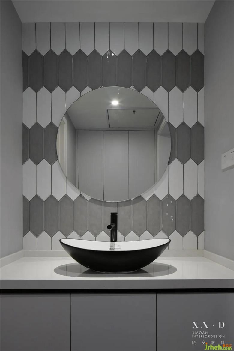 條紋幾何等時尚元素的加入,讓衛(wèi)生間成為一個現(xiàn)代感十足的空間。