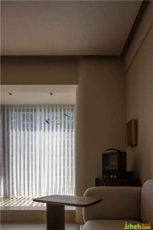 運河與岸裝修設(shè)計以編織紋理模擬水流波動的情景,運用以深賦淺的藝術(shù)筆法,增強客廳的明朗感。胡桃木色糅合框架結(jié)構(gòu),展開布局的敘事美感,以小巧邊幾補充客廳的功能性,同時擴張了開闊的活動空間。
