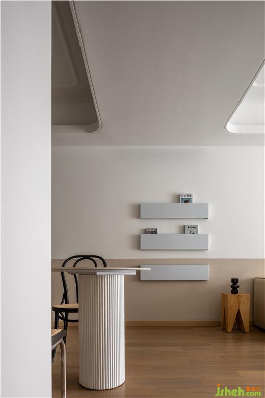 美的云筑家裝設(shè)計提取餐桌圓柱上的條紋元素,進行“稀釋”處理,最終以三段“平行線”裝飾客餐廳過渡區(qū)域,在過道盡頭形成一道新的風景,也讓家更有一種漫游感。稍微拓寬“平行線”的厚度,極簡的墻飾搖身一變,具備了收納功能。