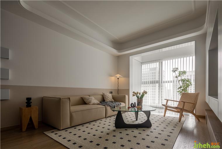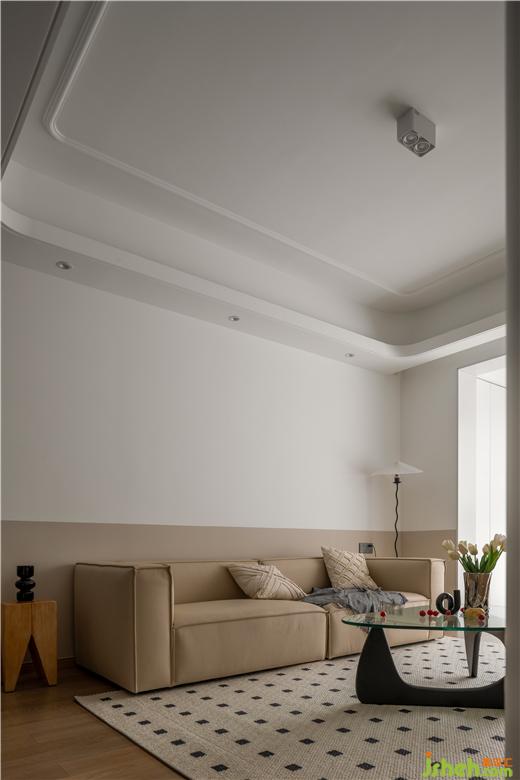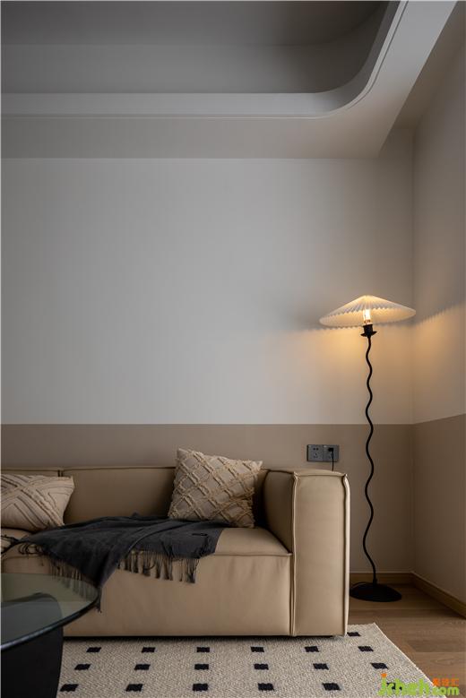 沙發(fā)、背景墻、電視柜的顏色相近,依靠色彩的延伸,醞釀出醇、靜的視感,喚醒了內(nèi)心對溫馨的感知力。美的云筑家裝設(shè)計(jì)自帶鏤空的邊幾,消弭了大體塊沙發(fā)的笨重感,攜手波浪身形的落地?zé)簦尶臻g多了些視覺層次。