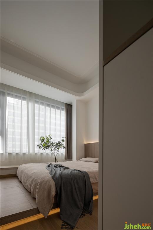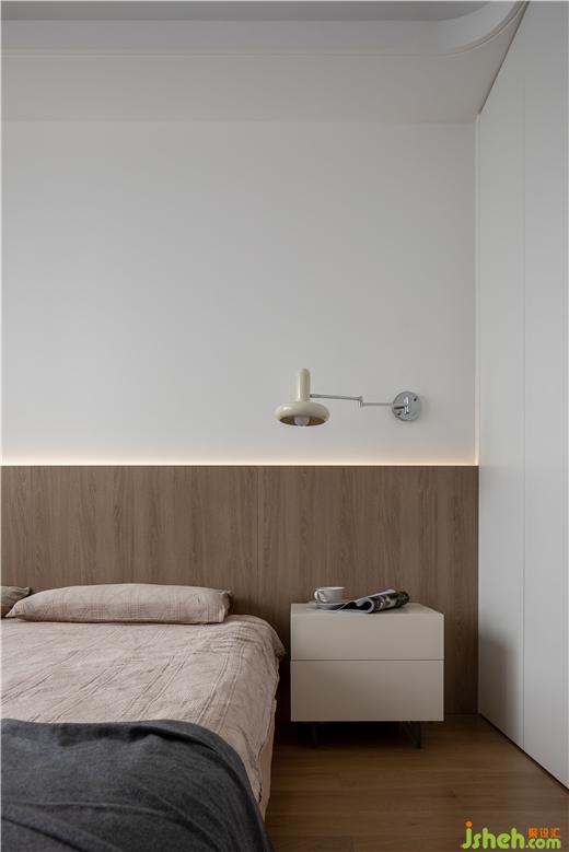 定制通頂衣柜,構(gòu)筑雙層地臺,預(yù)留閱讀區(qū),促成L形動(dòng)線,方便起居生活。采用木板上墻的手法,為睡眠縈繞安穩(wěn)感,嵌入暖色燈帶,以光書寫空間層次,整個(gè)臥室給人一種素雅無華、舒適無邊的感覺。