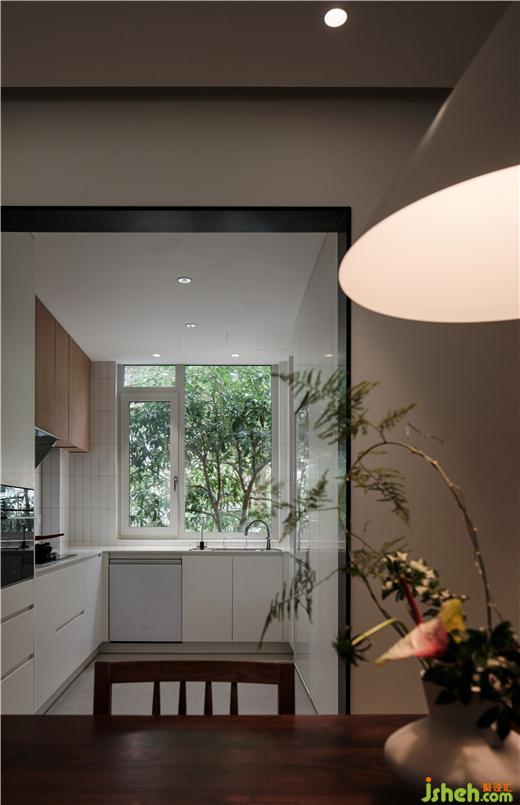 汲取客廳的造境方式,發(fā)揮開窗見“綠”的優(yōu)勢,強化空間的呼吸感與清新感。排布清洗、烹飪、存儲的區(qū)域,搭配簡約色調(diào),共鳴回歸自然的寓意??紤]空間轉(zhuǎn)折上的明暗關(guān)系,勾勒黑色門框,讓廚房自成一幅畫,裝點“畫中人”與“畫前景”。