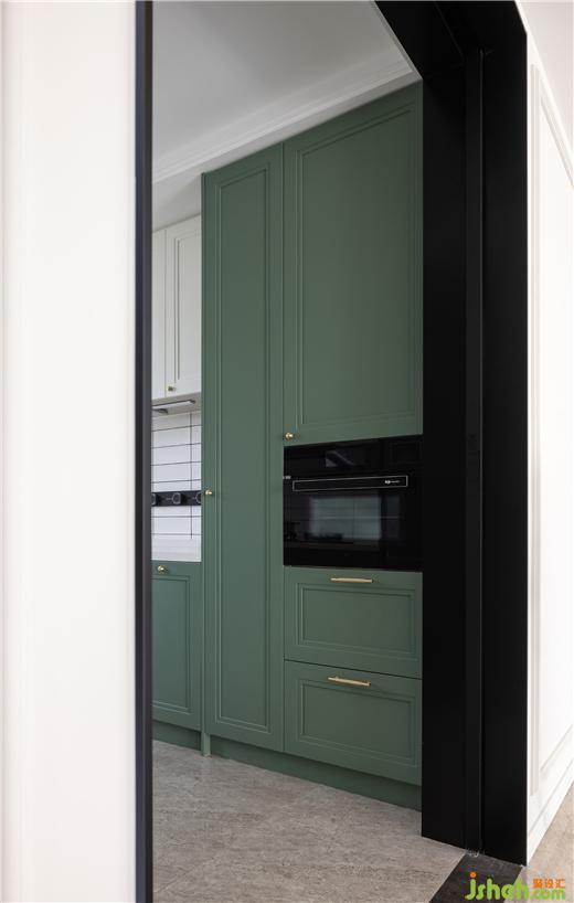 “喜歡敞亮的、能容納特別多家人一起做飯的廚房,真的很有家的感覺?!盪型布局廚房完美切割了各個功能區(qū),天鵝港豪宅設計讓空間變得合理有序。以白色挑動墨色與森綠,色塊間搭配的比例恰到好處——明朗,自如,又詮釋著法式的優(yōu)雅。