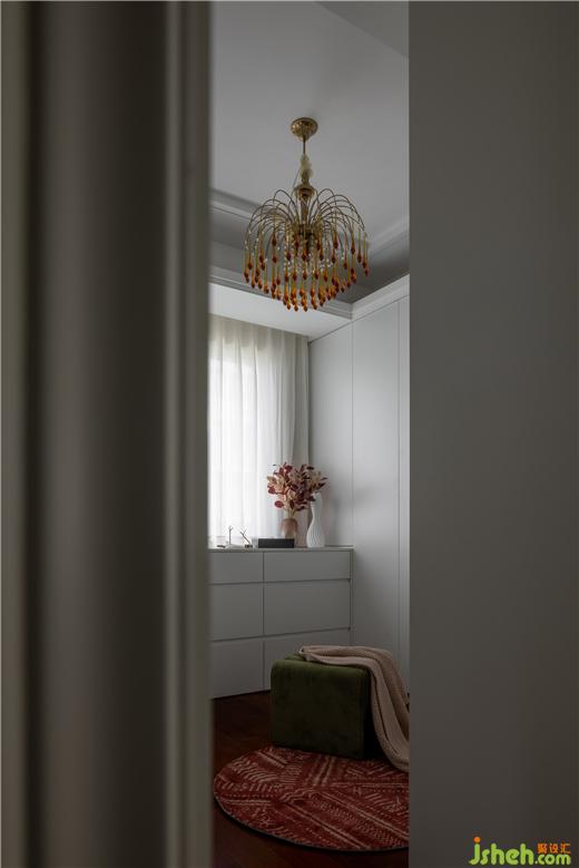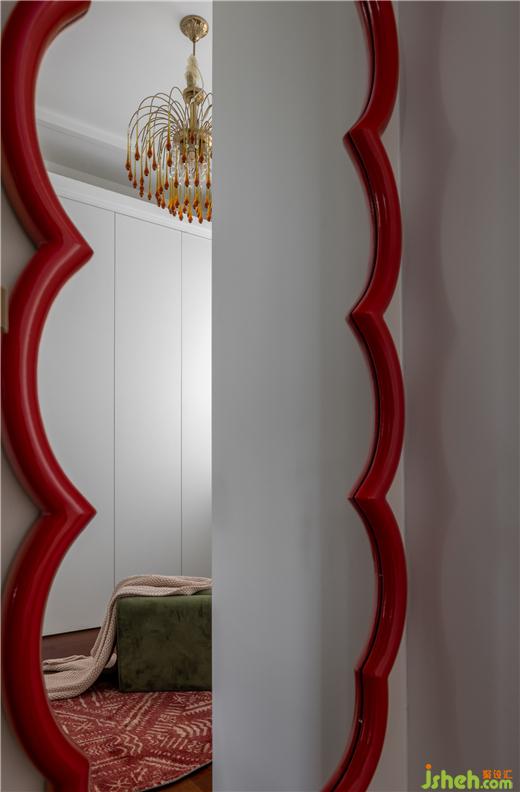 “藝術從來就不曾遠離我們,它們不露聲色地待在生活的每一個角落?!币旅遍g連貫的白色儲物柜,更顯得空間干凈整潔,天鵝港豪宅設計配合上紅色異形穿衣鏡,整個空間充滿了藝術氣息。專屬的燈光不僅是氛圍感的來源,更是個性與藝術的強烈表達。