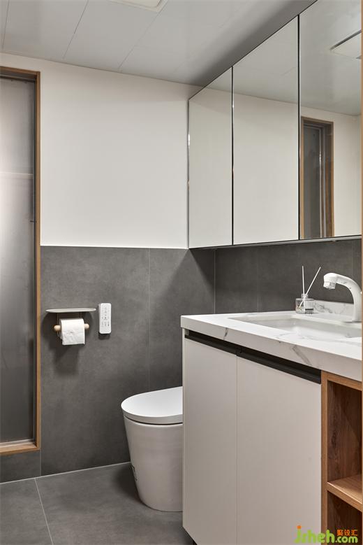 主衛(wèi),于清淺基調(diào)內(nèi)點綴深黑線條和暖金色澤,瞬間消弭了冷硬的體量感,調(diào)和出蘊含潔凈美、高雅性、便利性的空間秩序。大理石紋理讓人倍感放松與寧靜,滑動推拉門有效規(guī)劃出干濕區(qū)域。
