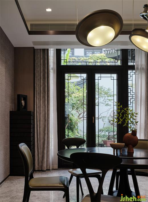 以島臺(tái)為中心,打造中西合并的烹飪環(huán)境,保留傳統(tǒng)窗花,搭配天然石紋與金屬的質(zhì)感,烘托出親近煙火,卻不失高雅格調(diào)的空間情態(tài)。
