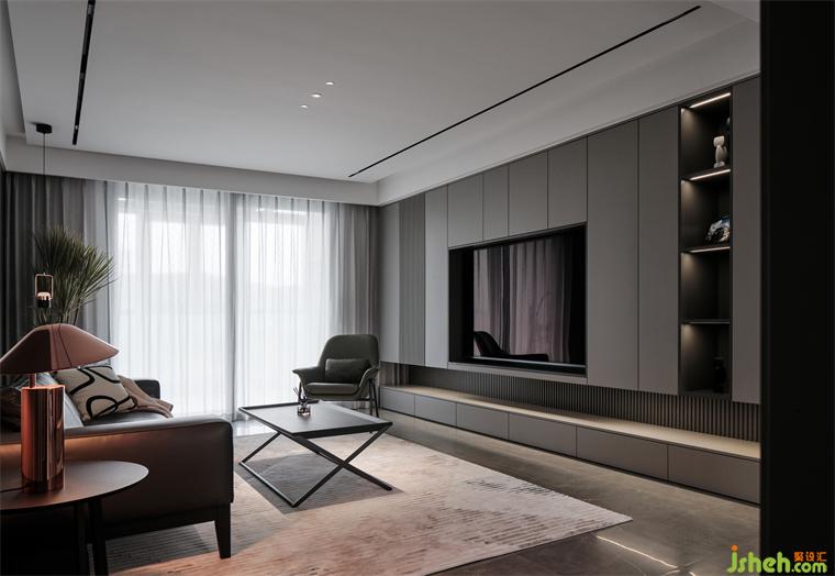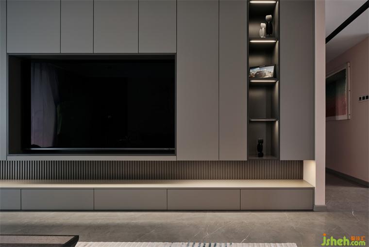大平層裝修設計利用統(tǒng)一色塊收納儲藏空間,細分從上至下的凹凸比例,糅合均勻的條紋,化解了電視背景墻的沉悶感與壓抑感,衍生出側(cè)旁的展示空間,達成一種視覺上的重輕平衡。