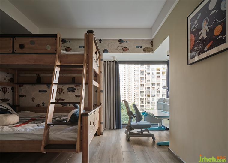 大平層裝修設(shè)計依據(jù)空間尺度特征,擺置原木高低床,劃分休憩區(qū)與書寫閱讀區(qū)。在細(xì)節(jié)處,甄選壁紙,縈繞出童真趣味,點(diǎn)綴探索太空的藝術(shù)畫作,在生活中呈現(xiàn)出一家人對孩子的無限關(guān)愛。