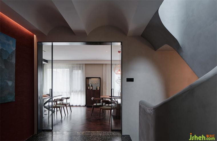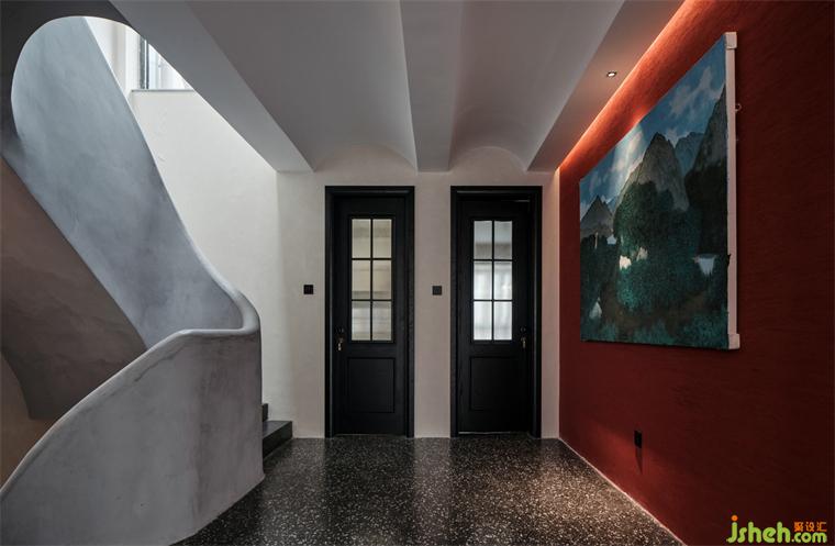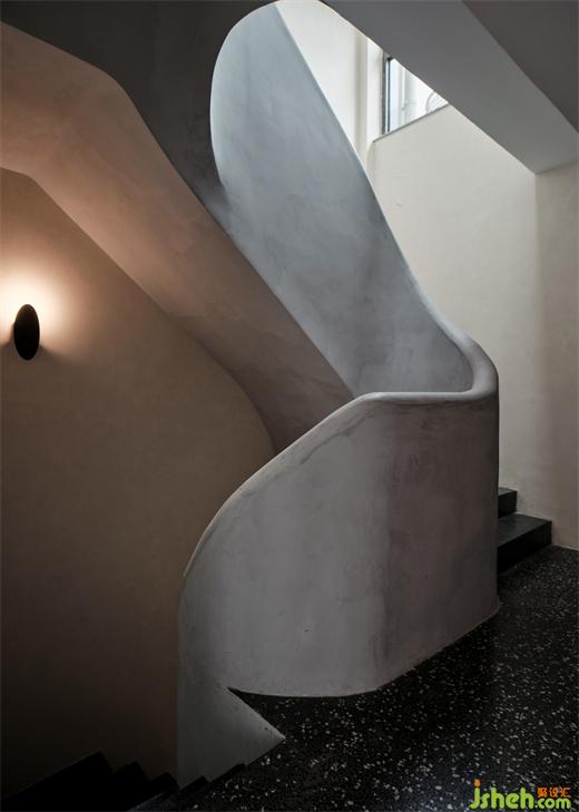 ▲二層樓梯間,純手工制作,優(yōu)美弧線造型樓梯
