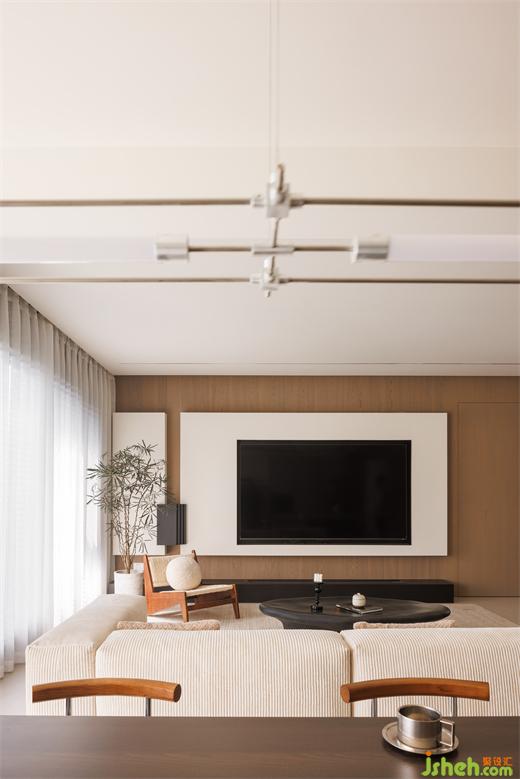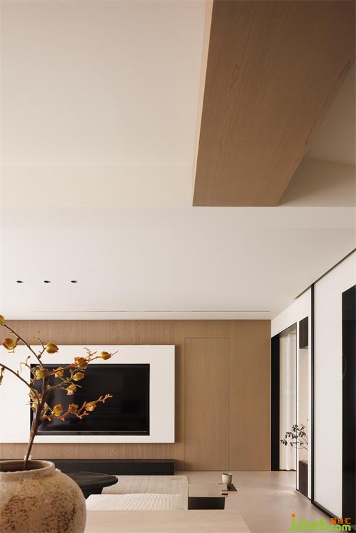 客廳沒(méi)有選擇整墻木飾面,避免空間顯得沉悶。大平層設(shè)計(jì)將門隱藏并化為電視背景墻的一部分,簡(jiǎn)潔精致,視覺(jué)上完整性也更強(qiáng),每一處細(xì)節(jié)都透露著對(duì)生活品質(zhì)的追求和對(duì)美學(xué)的尊重。