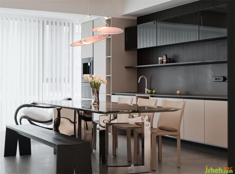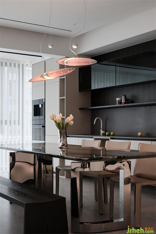 石材、木質(zhì)、不銹鋼等元素的融入,進(jìn)一步將餐廳的簡(jiǎn)練、大方展露無(wú)遺。精心選擇的燈飾設(shè)計(jì)精巧、極具漂浮感,也為每一次用餐增添視覺上的享受。