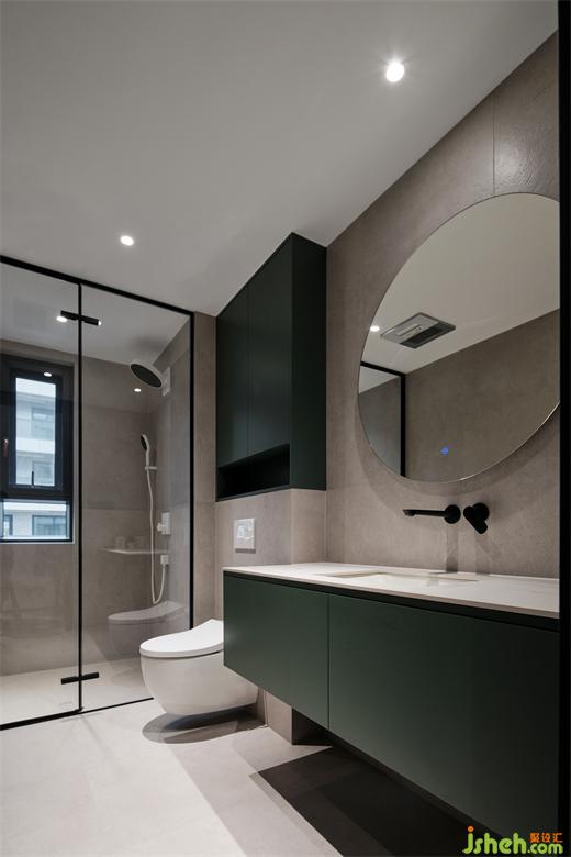 衛(wèi)生間的地面和墻面采用了大塊的灰色柔光磚,有一種“微水泥”的高級(jí)感,不僅美觀,還自帶防滑效果,增加空間的安全性。