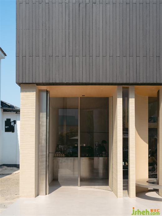 豎向線條由密集轉(zhuǎn)換為稀疏,展露分區(qū)??Х葟d設(shè)計劃分圓的四分之一作進出入口,降低室內(nèi)溫度的流失率,更明確地指引人流方向。