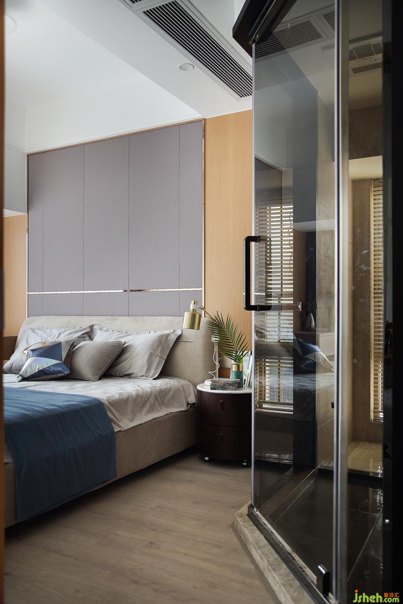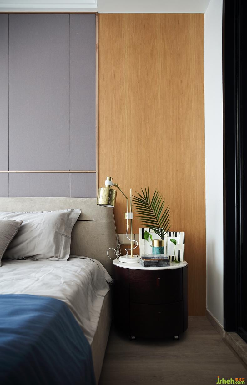臥室以暖色調為主,靈活運用木色、暖灰和藍色的搭配,打造了一個溫馨助眠的空間。