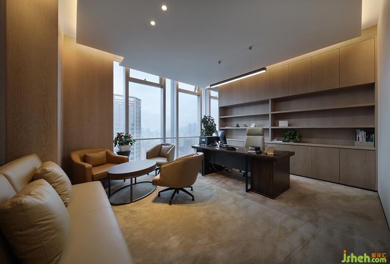 副總經(jīng)理辦公室,沿襲著沉穩(wěn)大氣的主基調(diào),天花吊頂根據(jù)戶型情況進(jìn)行了不規(guī)則造型處理,設(shè)計(jì)感十足。辦公桌后排是超大的組合柜,兼具美觀與實(shí)用。