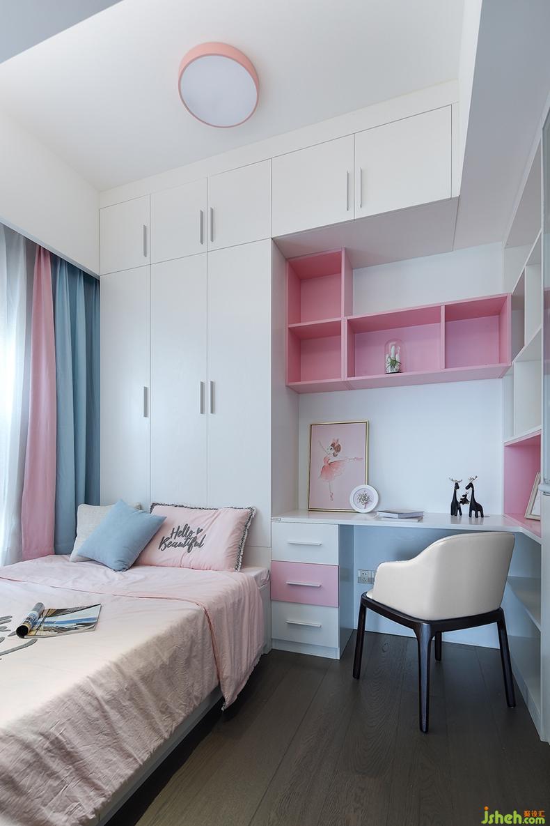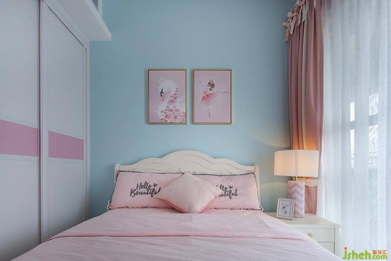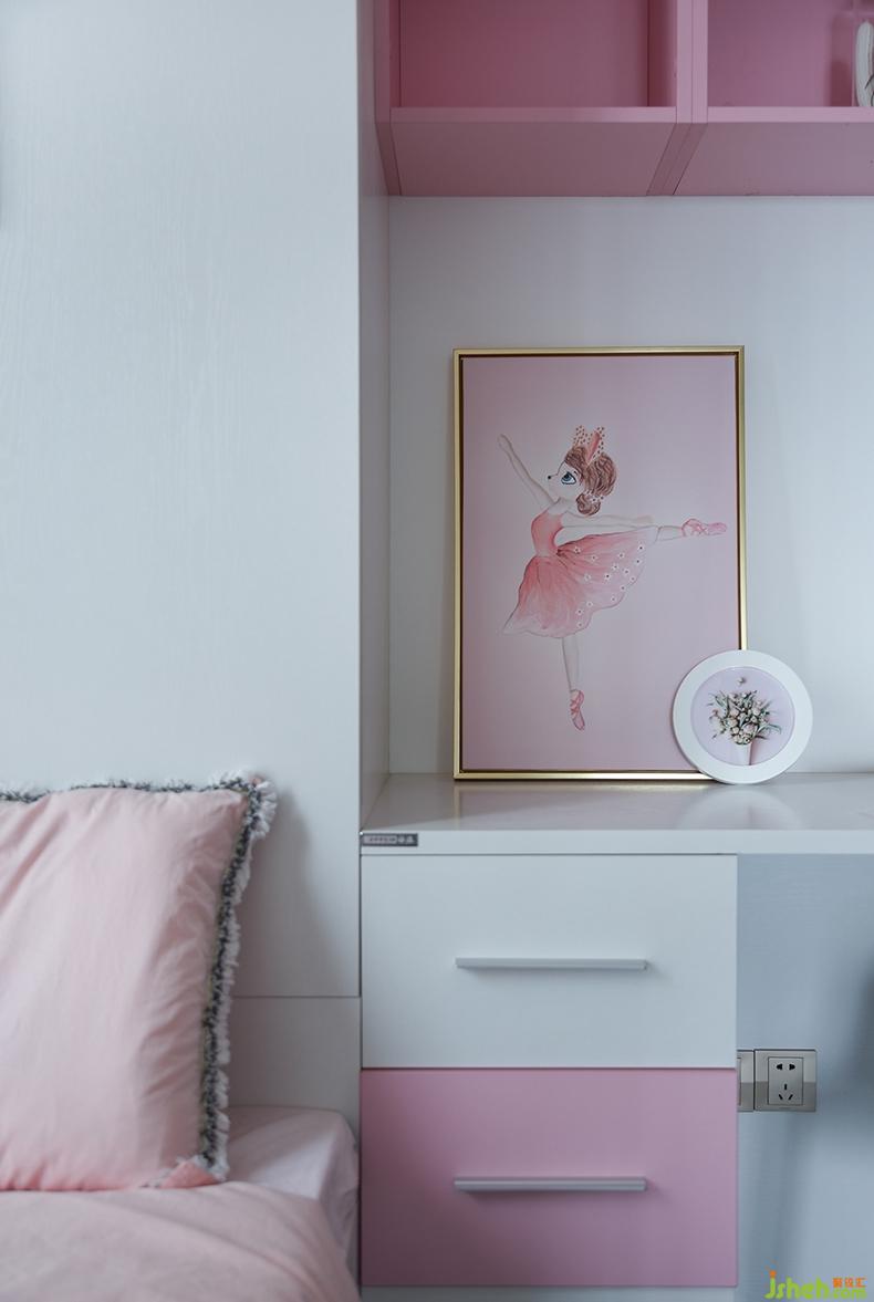 幼女著新裳,低眉畫(huà)紅妝,業(yè)主對(duì)于兒童房也做了精心布置。百粉天藍(lán)的搭配讓整個(gè)房間顯得明亮又清新,幾何體造型穿插在空間里,簡(jiǎn)潔又大方。