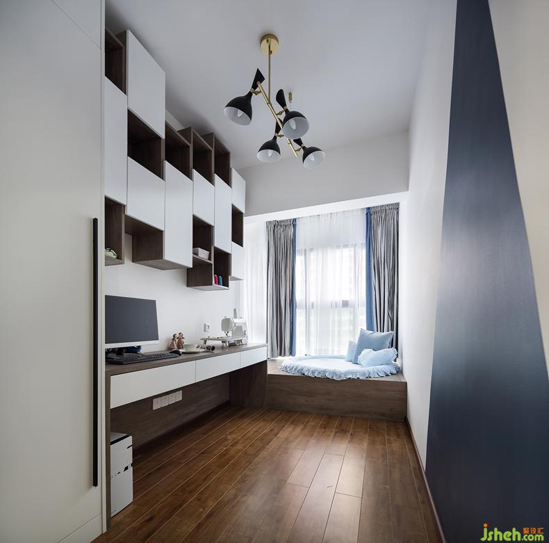 此外,將原來的陽臺歸到書房,置辦成靠窗的榻榻米,關(guān)上折疊門,又是獨立的客房。這一方天地,更是小孩的讀書角和游樂園,是親子互動的好去處。設(shè)計公司