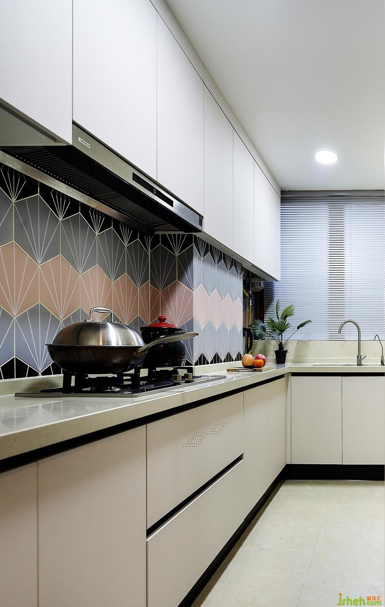L型廚房,半開放的空間,沒有轉(zhuǎn)角的尷尬,簡(jiǎn)單又實(shí)用。中間選用五彩不斑斕的墻磚,不一樣的紋理,是溫度與色澤的點(diǎn)綴,怡然自得。