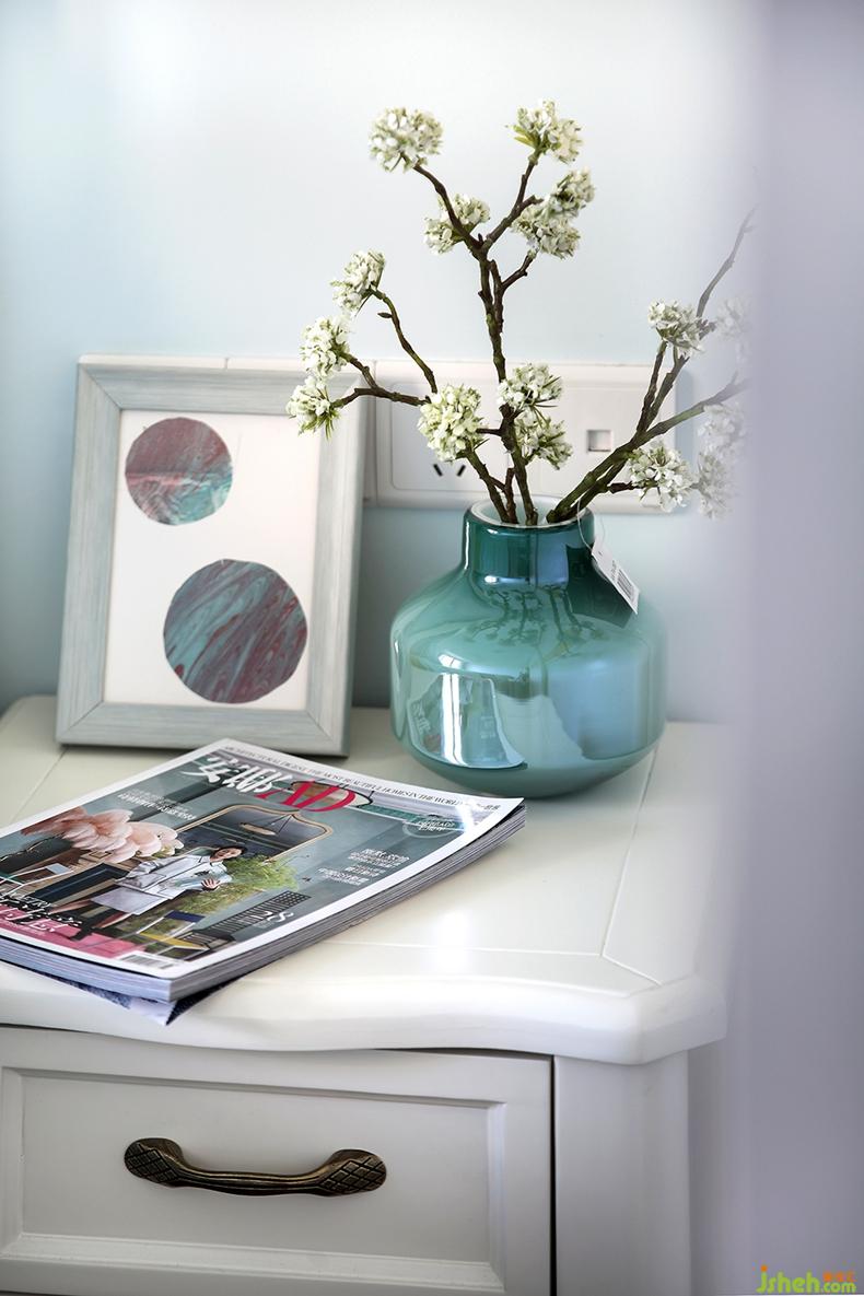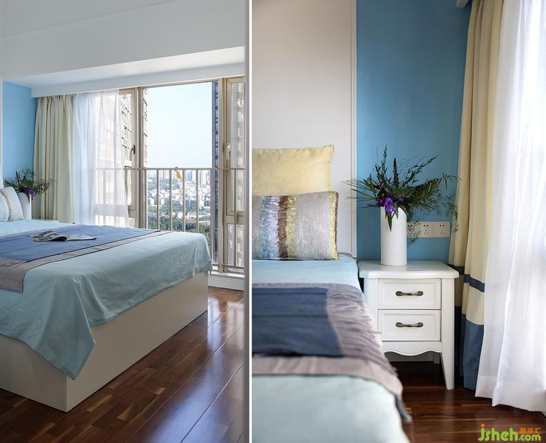 臥室墻面不似客廳的暖米色,而是選用了米白色;地面也鋪滿沉穩(wěn)溫潤(rùn)的木色地板,搭配上藍(lán)綠色的床品,瞬間注入浪漫的基調(diào);床頭用藍(lán)白對(duì)比色也烘托出滿室的溫馨優(yōu)雅。設(shè)計(jì)公司
