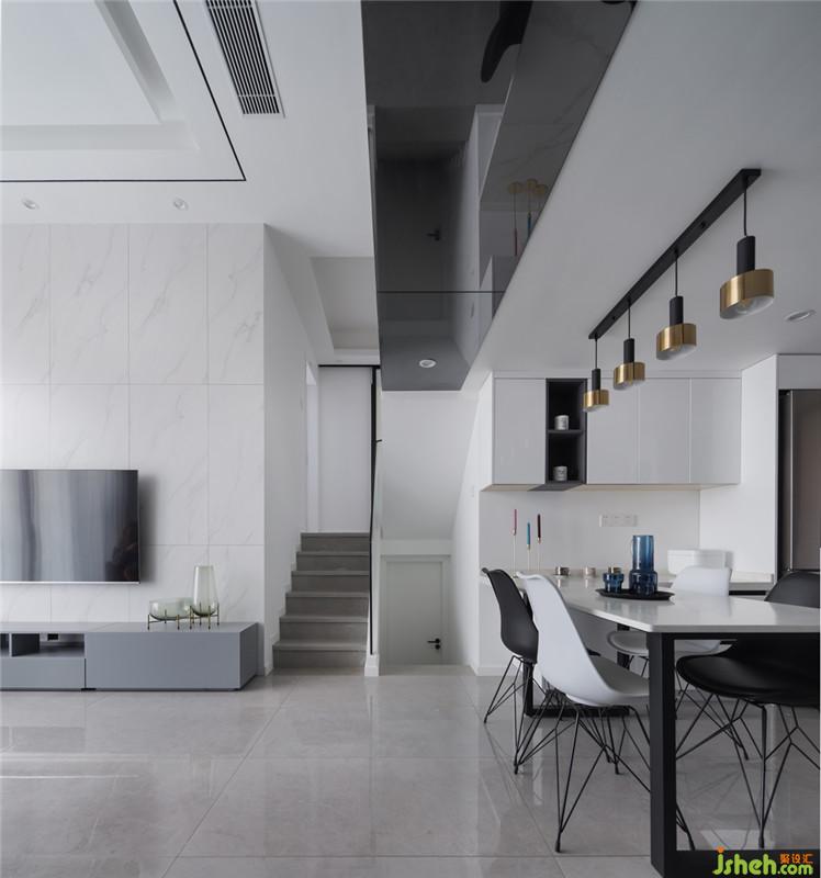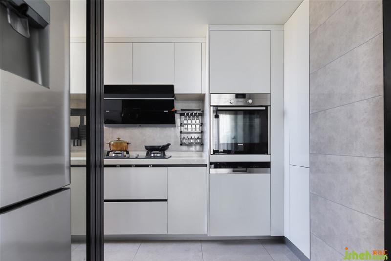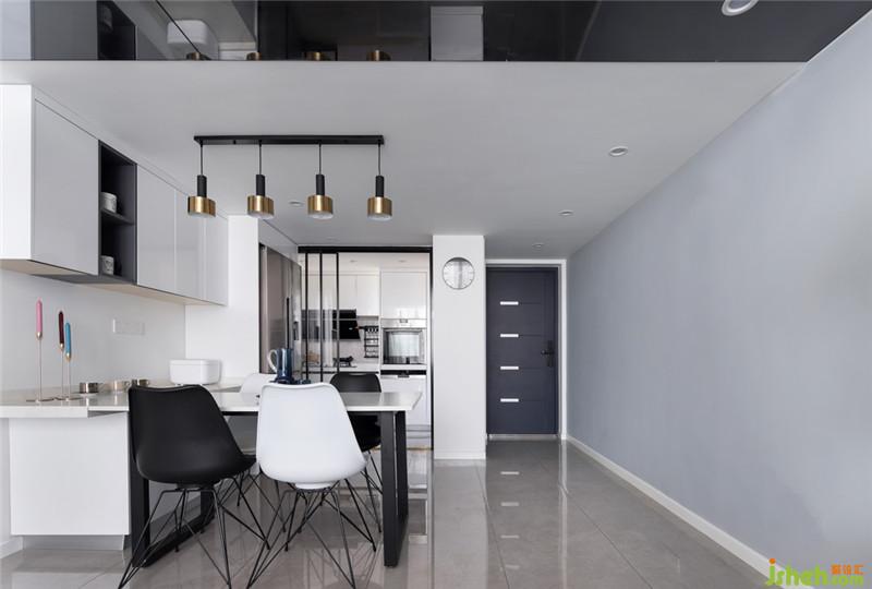 延續(xù)了黑白色調(diào)的搭配,半開放式的廚房也可完美融入公共區(qū)域,擴大視覺空間感。而無論透過玻璃門的是燈光還是日光,都能營造享受烹飪的氛圍,讓廚房充滿煙火氣。