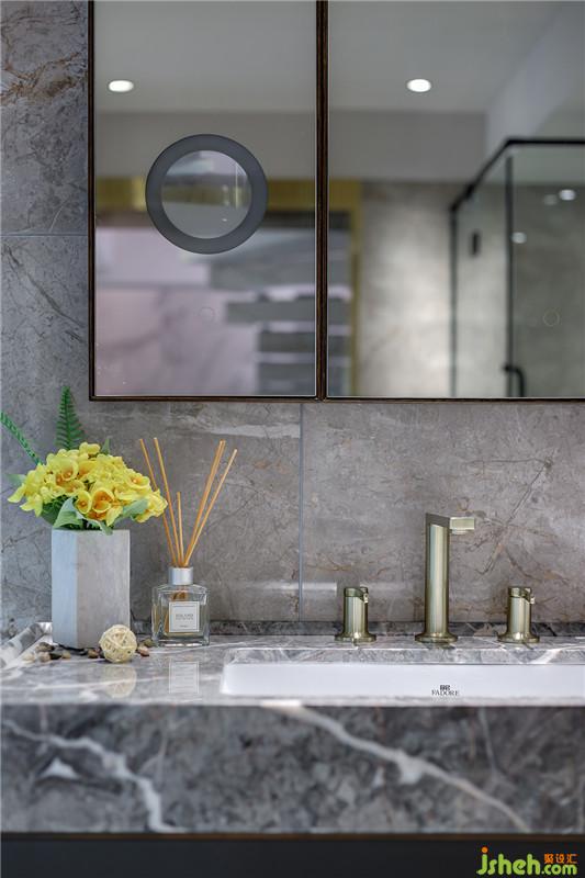 進(jìn)入產(chǎn)品展示區(qū)二,映入眼簾的,是散發(fā)著柔光的玻璃淋浴間和灰色素雅的瓷磚墻,借著洗漱盆上照映的燈光,仿佛能看到洗浴后圍繞的熱氣,混著沐浴的香氣,絲絲入鼻。