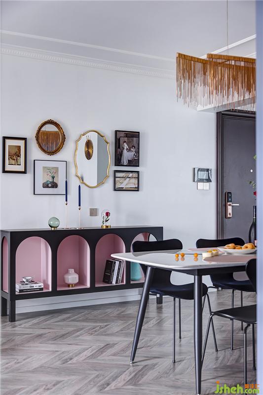 進門便是一抹明媚搶眼的粉色,穿透在黑色烤漆餐邊柜里,點亮一室的輕奢氣息。柜子借鑒了建筑設計中的拱形結(jié)構(gòu),活潑且極具陣列構(gòu)造感,鏤空半滿的造型洋溢著輕奢的氣息,為空間增添活力,帶來滿滿的藝術格調(diào)。