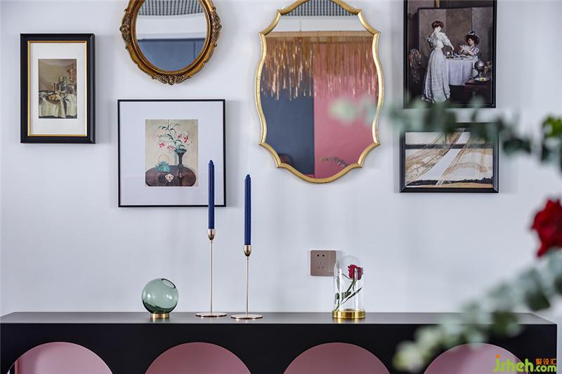 墻面可謂是最好的風景展示區(qū),餐邊柜上懸掛六項規(guī)格不一的裝飾,既有家庭場景的復古油畫又有精致典雅的鏡子,看似毫無關聯(lián),但都極具生活氣息,精心設計過的排列方式也讓餐廳增添了別樣的美感,成為家中一道亮眼的風景線。
