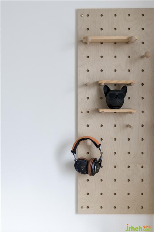 臥室延續(xù)簡潔干凈的基調(diào),原木色的地板、素白色的墻面、暖灰色的家具以及同色系的床品和窗簾,和諧簡約又不失設(shè)計感。床尾洞洞板的使用也格外有趣,不再是壓迫空間式做滿到頂?shù)囊鹿瘢且愿匀?、靈動的姿態(tài)出現(xiàn),滿足實用功能的基礎(chǔ)上,最大程度釋放空間感。