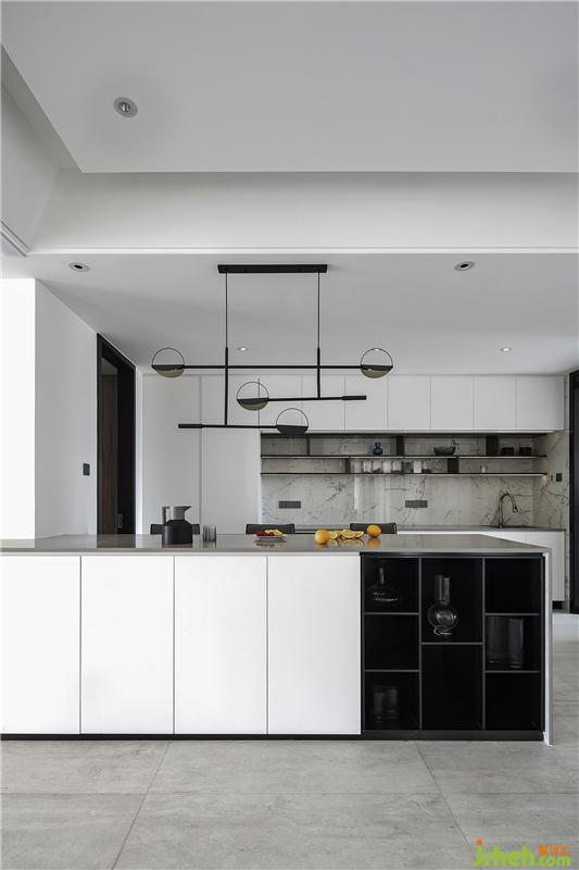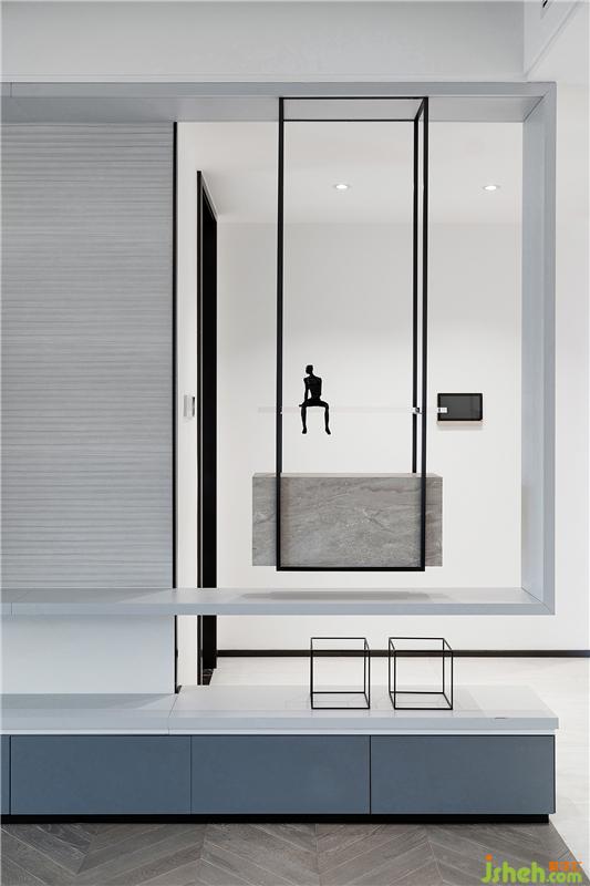黑色鋼條與大理石、烤漆板和瓷磚之間的體塊穿插和組合讓空間更有趣味,同時也便于業(yè)主及時看到入戶情況,而從外往里看則會覺得內(nèi)有乾坤,空間更有延伸感。
