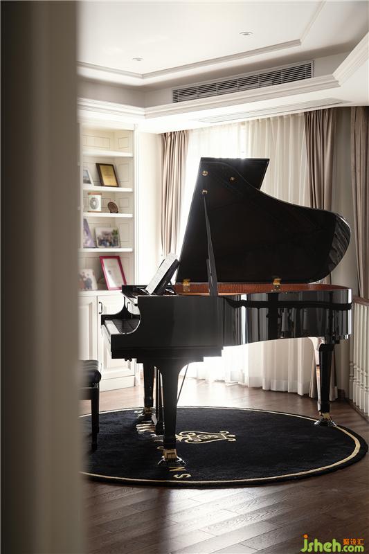 靠近挑空位的是鋼琴區(qū),黑色的三角鋼琴搭配同色的琴椅、地毯,無形中圈定了一塊兒專屬于音樂的空間。眼前是開闊、有延伸感的挑空位,側(cè)面是陽光正好、微風(fēng)吹拂的陽臺(tái),在這兒開一場小型音樂會(huì),真是再適合不過了!