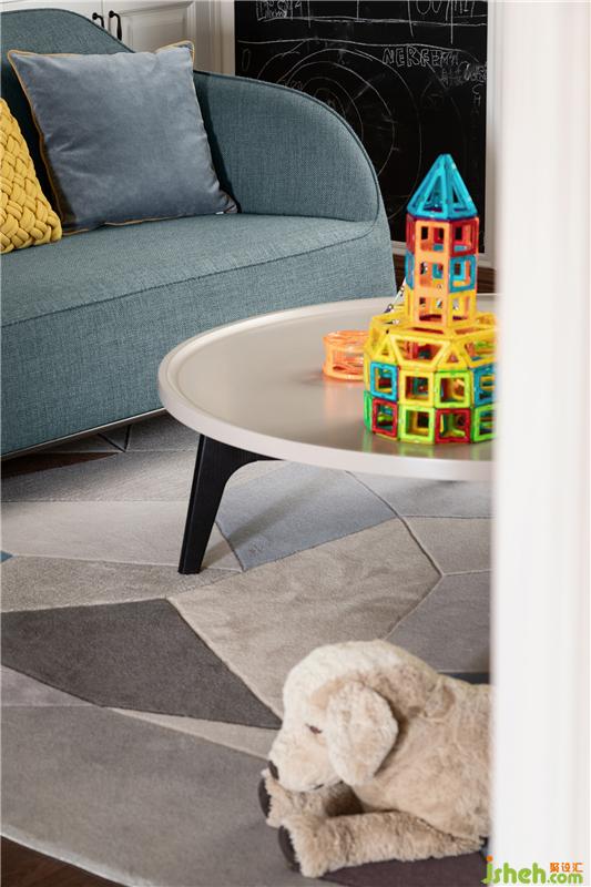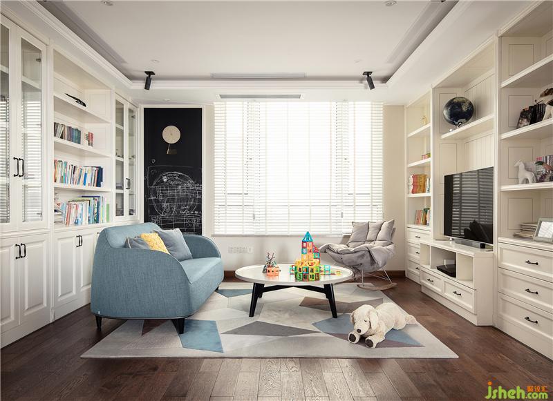 會(huì)客廳以月白色為主,電視背景墻與沙發(fā)背景墻都是收納柜的形式,書籍、擺件、玩具都有處可放,更顯干凈、明亮。這里也是兩個(gè)孩子玩耍、閱讀的主要區(qū)域,而活動(dòng)家具則選擇偏圓潤、平滑的款式,以免碰傷。