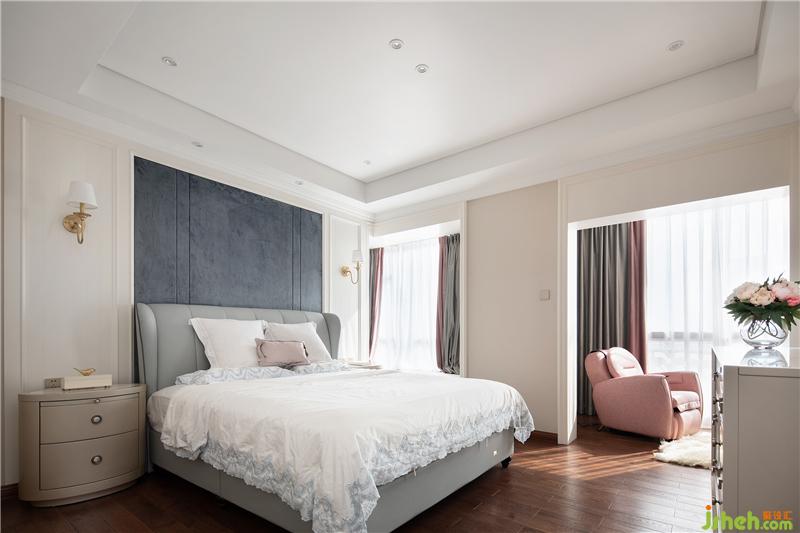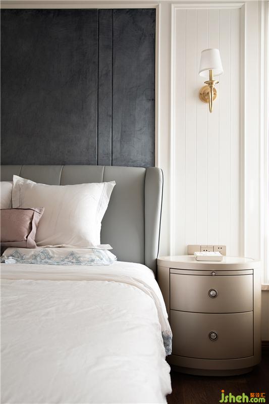 灰色皮質(zhì)大床搭配米色床頭柜,床品則以素色為主,跳出一個(gè)臟粉色的抱枕,柔化空間氛圍。窗簾選用灰+粉的拼色設(shè)計(jì),既呼應(yīng)了空間色調(diào),又營造了臥室空間的柔美情調(diào),讓每次回到臥室都倍覺享受。