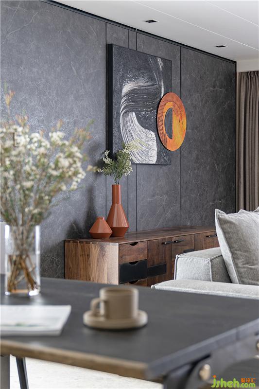 家里有兩只喵喵,為了讓他們有更寬敞、安全的玩耍區(qū)域,半高的封閉式成品柜成為了收納的首選。一眼望去,公共區(qū)域是敞亮、通透、無拘束的。背景墻一面保留原有的暖米色硬包,另一面則換成了深色的木制石紋護墻板,搭配暖灰色布藝沙發(fā)、拼色抽象派地毯、深色木制家具等,流暢的線條比例與色塊組合,展現(xiàn)出業(yè)主卓爾不凡的藝術品位。