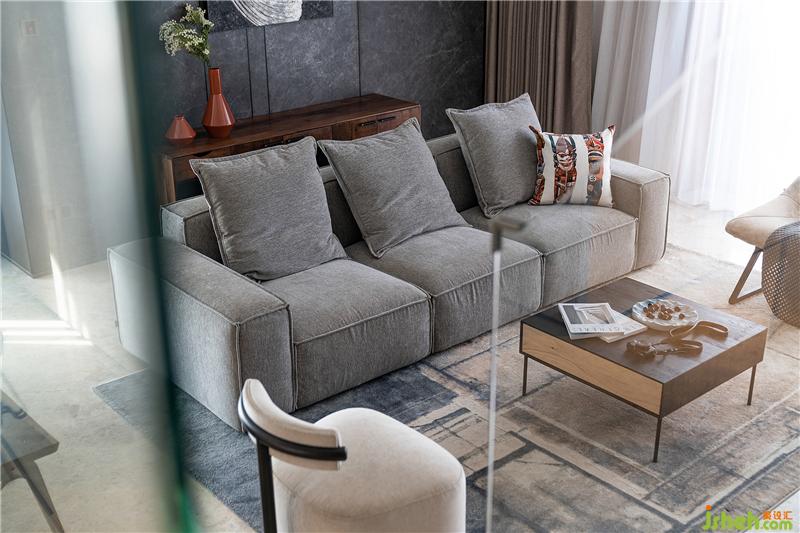 暖灰色布藝沙發(fā)和深色木制儲物茶幾、暖白色休閑椅相當搭配,款式新穎又休閑舒適,充滿美好且文藝的氣息。
