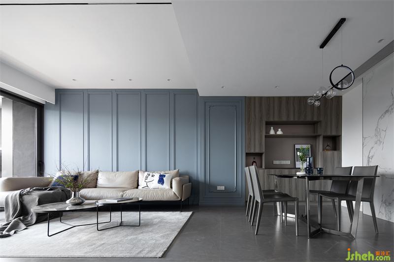 客餐廳以背景墻進(jìn)行功能區(qū)域的劃分。霧霾藍(lán)自帶復(fù)古濾鏡,將周邊一并卷入朦朧美感之中,文藝范兒十足,隨意一拍就是大片即視感。