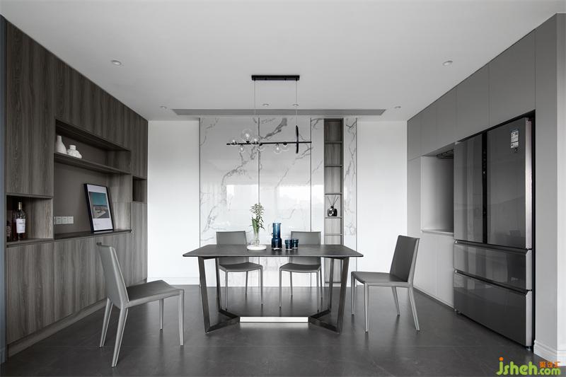 透過大面積落地窗迎接自然光入住,光、影、材的相互映照,視覺上越發(fā)和諧,營造理性內(nèi)斂的奢華感。以高級灰為主基調(diào),搭配紋理清晰的木飾面餐邊柜,整體干凈素雅、通透高級。