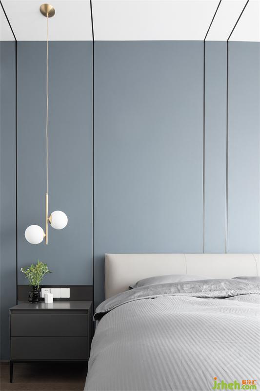 主臥延續(xù)霧霾藍(lán)的主色調(diào),以整面硬包+不銹鋼作為床頭背景墻,一派沉穩(wěn)靜謐之感。墻面不銹鋼更是順勢(shì)延伸至天花頂面,巧妙成為裝飾造型,令空間在視覺(jué)上更有延展性。