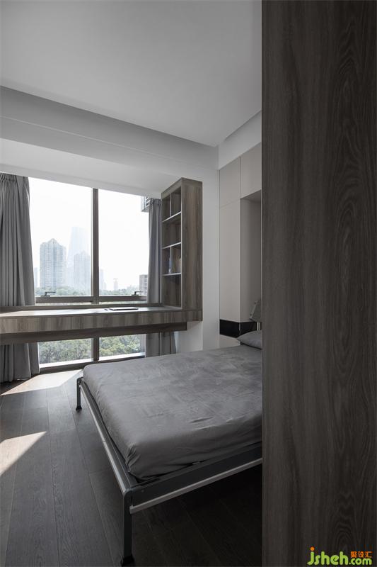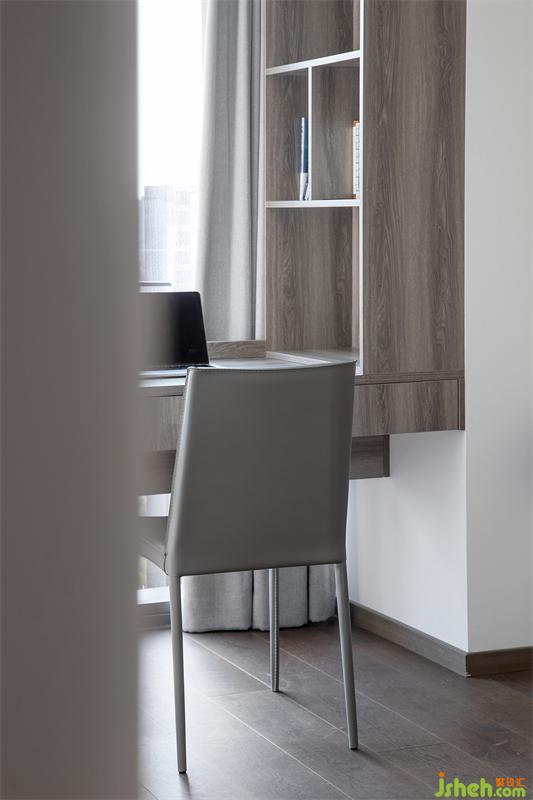 書(shū)房也是臨時(shí)的客房,以翻板床+書(shū)桌形式滿足多重功能需求。靠窗定制一整排書(shū)桌,順沿梁位定制一豎排書(shū)柜,既增加了收納空間,也解決了書(shū)桌受力問(wèn)題。在這里,采光好、景色好、視野開(kāi)闊,就連辦公都十分愜意。