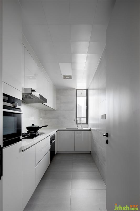 廚房素雅大氣,淺灰色地磚搭配淺色紋理墻磚和白色櫥柜,純凈的配色勾勒出簡(jiǎn)約大氣的烹飪空間。
