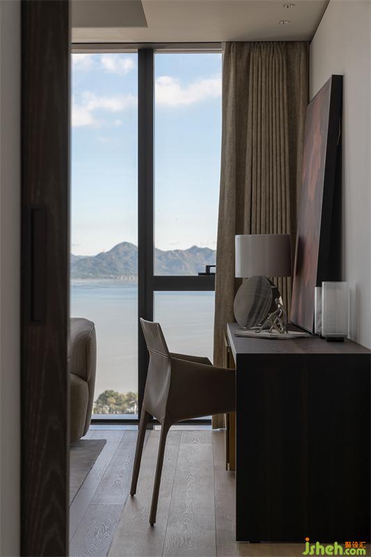 主臥擁有絕佳的采光和視野,深圳豪宅設(shè)計(jì)以暖色為基調(diào),搭配Poltrona Frau床和沙發(fā),圓潤(rùn)的造型與硬朗的懸浮天花形成對(duì)比,剛?cè)岵⑷胪昝廊诤希瑑?yōu)雅精致的質(zhì)感彰顯高級(jí)溫柔格調(diào)。