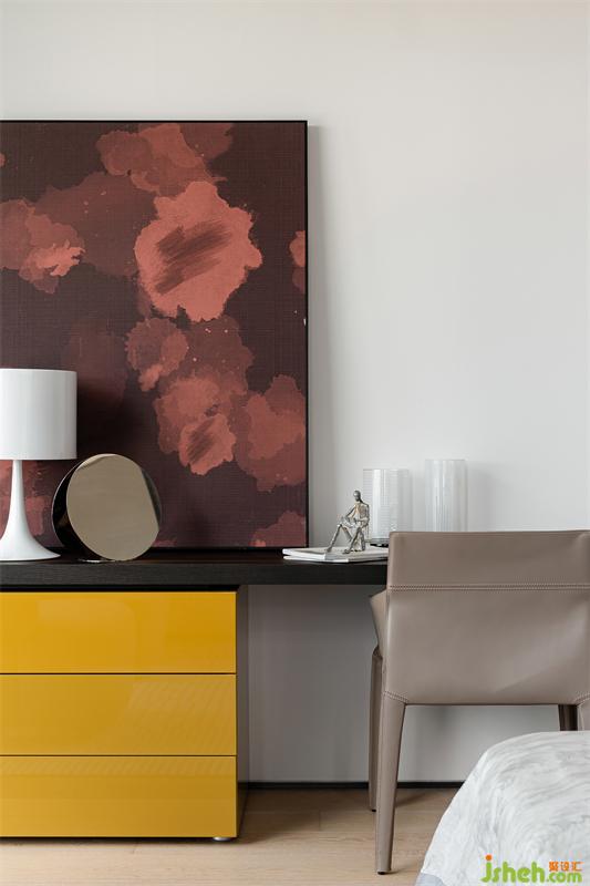 玄關(guān)端景選用Poltrona Frau玄關(guān)柜搭配Joel Amit彩色魚群藝術(shù)畫,使回家的第一視覺感便是五彩斑斕的,活躍的色彩令人心情愉悅,涌動(dòng)著年年有余、吉祥如意的美好寓意。